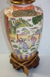Hand Painted Chinese Vase, oriental scenes, made into lamp on wood base, cracks at top; 30 1/2" including finial Hand Painted Chinese Vase, oriental scenes, made into lamp on wood base, cracks at top; 30 1/2" including finial