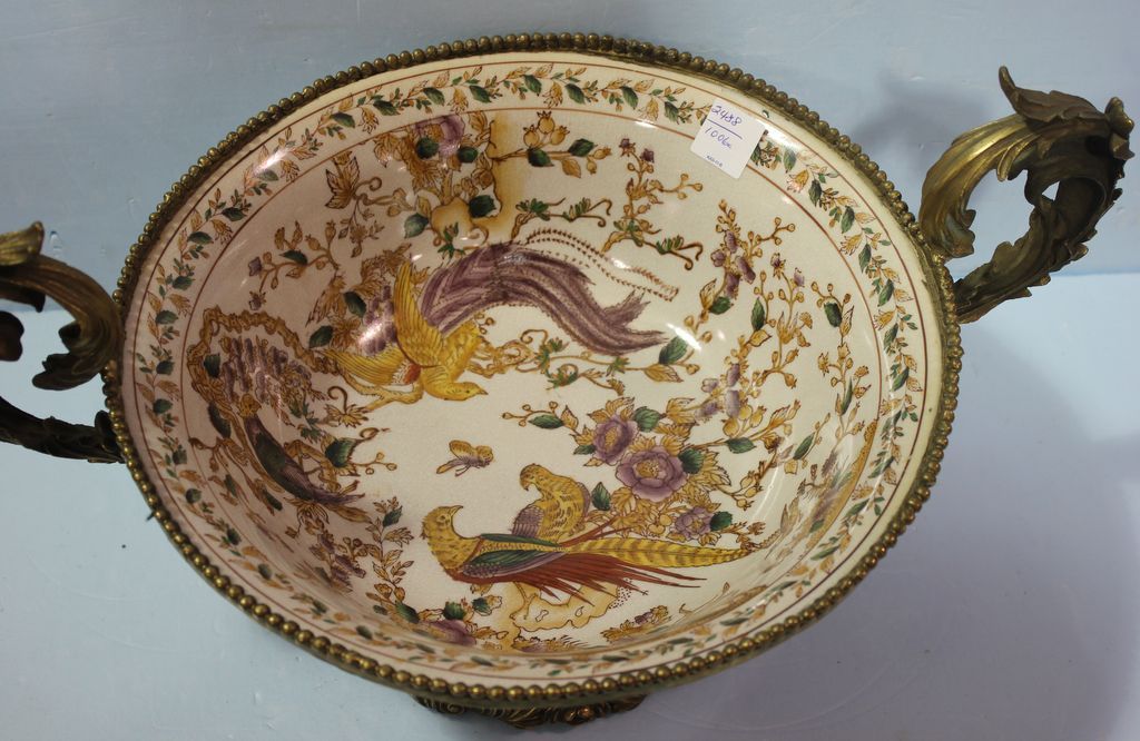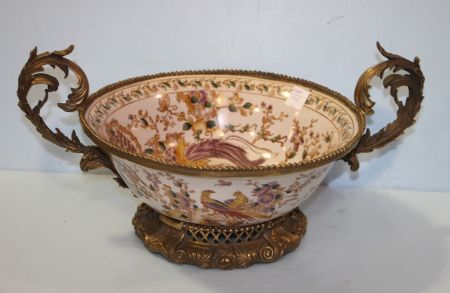 Sarreid, Ltd. Hand Painted Porcelain Bowl in Bronze Frame, two handles; 12" dia. Sarreid, Ltd. Hand Painted Porcelain Bowl in Bronze Frame, two handles; 12" dia.