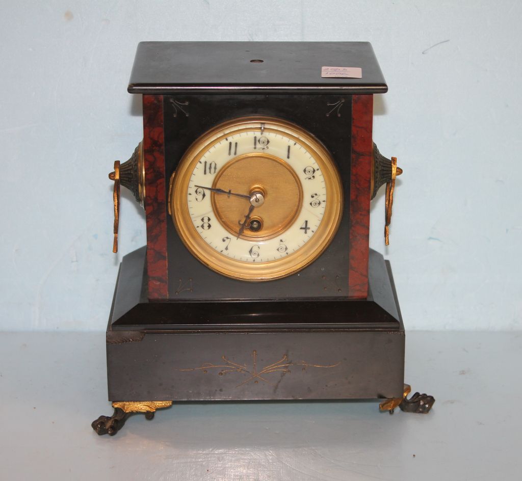 19th Century English (London) Black Slate Mantel Clock, missing pendulum and finial; 8 1/2" w., 9" h. 19th Century English (London) Black Slate Mantel Clock, missing pendulum and finial; 8 1/2" w., 9" h.