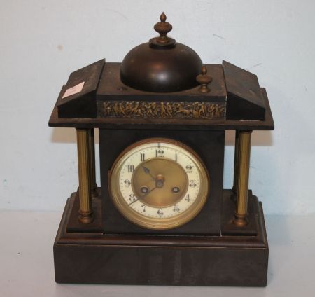 20th Century or Late 19th Century French Slate Mantle Clock Marked Fabrique de Paris, missing finial, needs restoration; 10" w., 13" h. 20th Century or Late 19th Century French Slate Mantle Clock Marked Fabrique de Paris, missing finial, needs restoration; 10" w., 13" h.