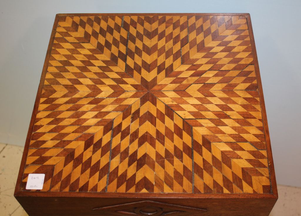 Handmade Inlaid Starburst Top Parlor Table; 15 1/2" square, 28 1/2" h. Handmade Inlaid Starburst Top Parlor Table; 15 1/2" square, 28 1/2" h.