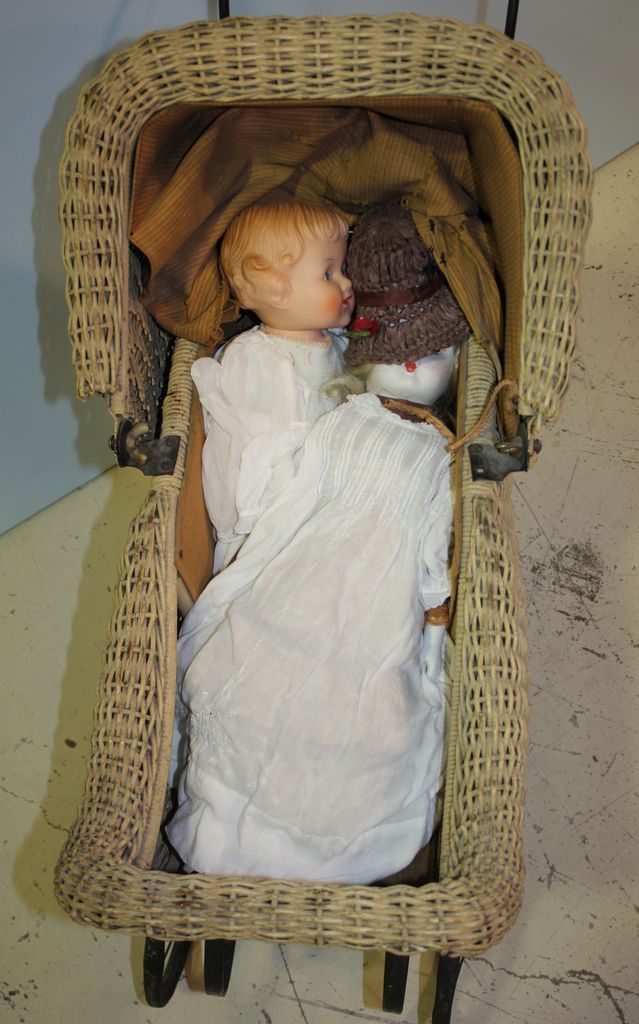 Early 20th Century Doll Stroller, wicker; 31" w., 25" h. Early 20th Century Doll Stroller, wicker; 31" w., 25" h.