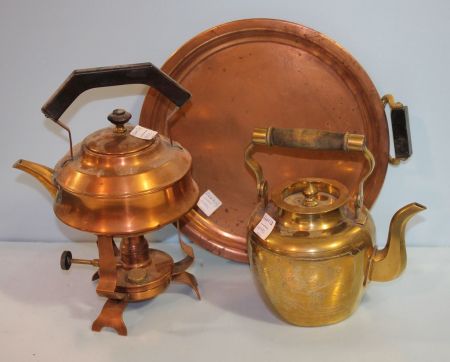 2662 Copper Tray and a Brass Kettle with Wood Handle and Etching