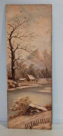 Oil Painting of Cabin in Mountains, snow scene; 7 1/2" w., 20 1/2" h. Oil Painting of Cabin in Mountains, snow scene; 7 1/2" w., 20 1/2" h.