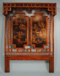 A fine lacquer & bamboo architectural headboard, with two panels of hand painted oriental scenes, lacquered and gilded on burled wood; 83" h., 60" w. A fine lacquer & bamboo architectural headboard, with two panels of hand painted oriental scenes, lacquered and gilded on burled wood; 83" h., 60" w.