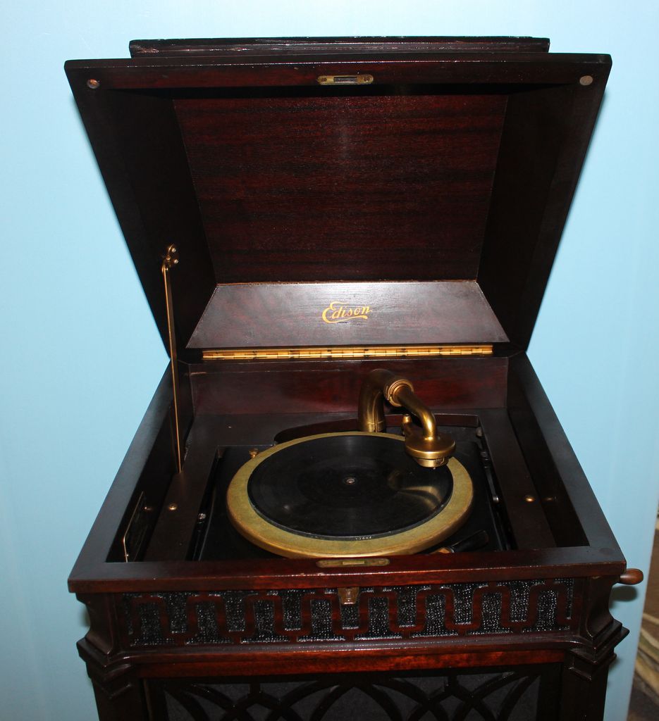 Edison 1917 Diamond Disc (thick records) phonograph. There are two doors which open to reveal two slide out drawers. Has the original book with it, and works well; 20 1/2" w., 22" d., 51" h.0 Edison 1917 Diamond Disc (thick records) phonograph. There are two doors which open to reveal two slide out drawers. Has the original book with it, and works well; 20 1/2" w., 22" d., 51" h.0