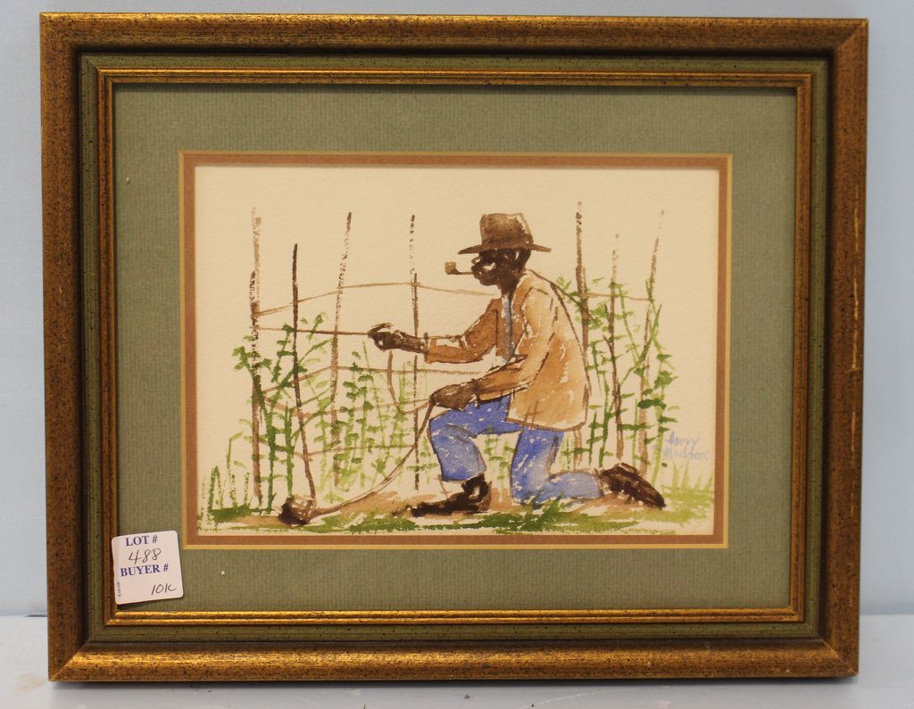 Watercolor of African American planting tomato plants signed by Mississippi artist Harry Maddox; 12" w., 9 1/2" h. Watercolor of African American planting tomato plants signed by Mississippi artist Harry Maddox; 12" w., 9 1/2" h.