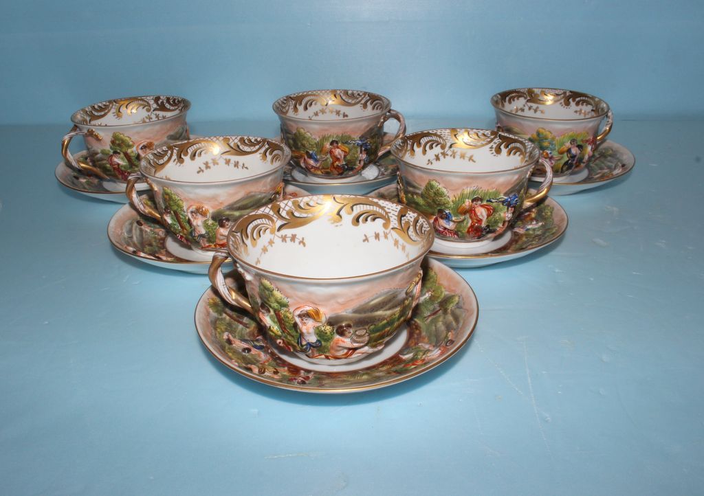 23148 Late nineteenth century set of six hard paste capodimonte five cups and six saucers; 6" w. saucers; 2 1/2" cups