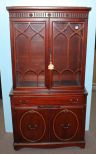 23174 Mid twentieth century mahogany China cabinet. Small cabinet with two glass doors having simple gothic, arch design on doors, drawer over two oval panel doors; 35 1/2" w., 16" d., 69" h.