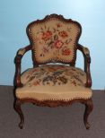 Early 1900's or late 1800's walnut carved French arm chair having crest and rail rose carvings, cabriole legs. The seat and back are upholstered in floral needlepoint decorated with brass upholstery tacs; 24 1/2" w., 20" d., 33" h. Early 1900's or late 1800's walnut carved French arm chair having crest and rail rose carvings, cabriole legs. The seat and back are upholstered in floral needlepoint decorated with brass upholstery tacs; 24 1/2" w., 20" d., 33" h.