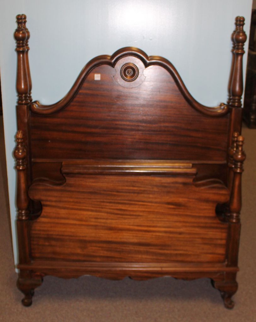 23197 Pair mahogany queen ann style poster beds having scroll head boards supported by turned post; twin size; 55" h.