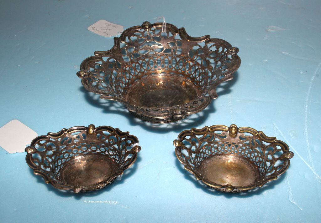 Three sterling nut dishes. One nut dish is larger and two smaller dishes. Larger dish, 5" dia. ; smaller dishes, 3" ; approx. 2.80 ozt Three sterling nut dishes. One nut dish is larger and two smaller dishes. Larger dish, 5" dia. ; smaller dishes, 3" ; approx. 2.80 ozt