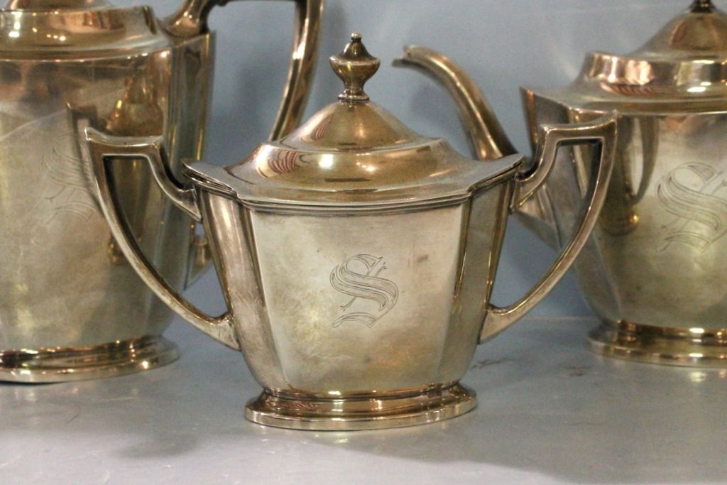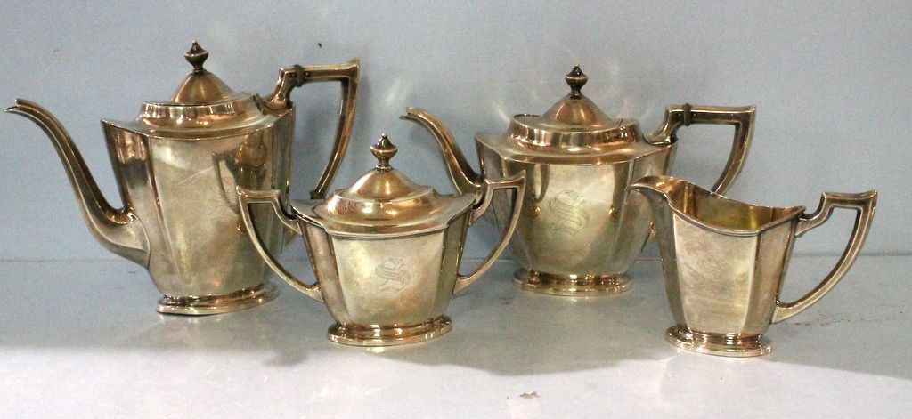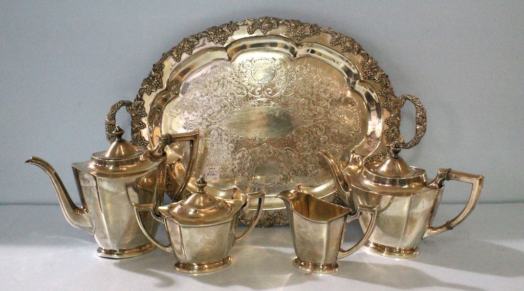 Four piece international sterling tea set with large silverplate tray, set consisting of coffee pot, teapot, sugar, creamer and ornate 23" grape design footed tray. 4 pieces not including tray weighs 53.605 Four piece international sterling tea set with large silverplate tray, set consisting of coffee pot, teapot, sugar, creamer and ornate 23" grape design footed tray. 4 pieces not including tray weighs 53.605