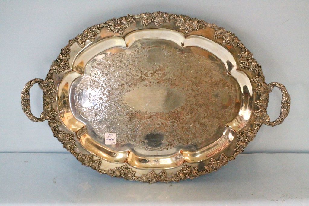 23226 Four piece international sterling tea set with large silverplate tray, set consisting of coffee pot, teapot, sugar, creamer and ornate 23" grape design footed tray. 4 pieces not including tray weighs 53.605