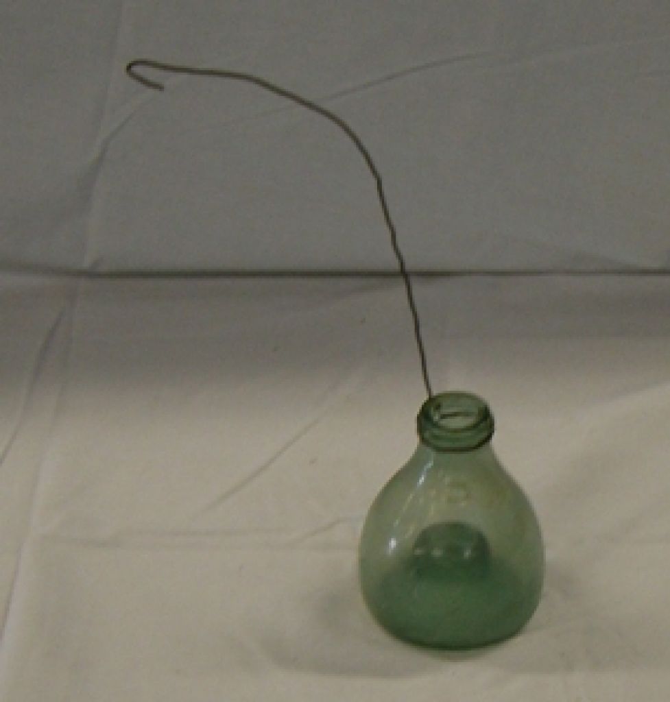 Very early glass fly catcher with wire around top. Open at top and bottom. 5 inches in height, 3.5 inches in width at bottom. Very early glass fly catcher with wire around top. Open at top and bottom. 5 inches in height, 3.5 inches in width at bottom.