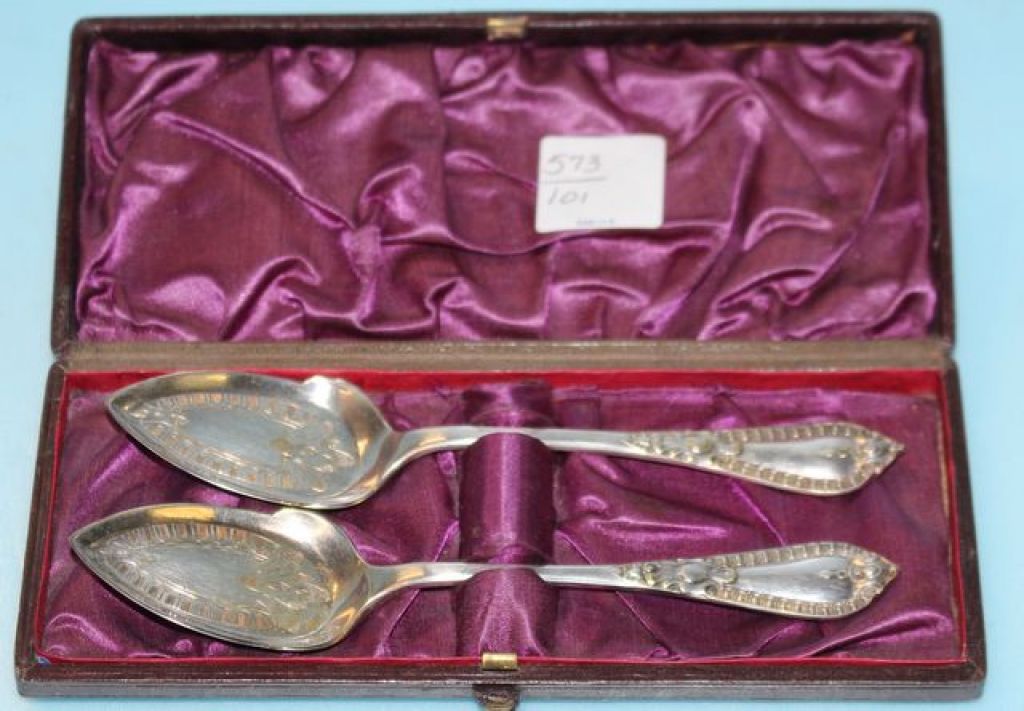 576 Two Bright Cut Silverplate Victorian Spoons in Box