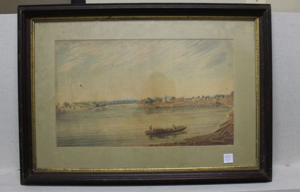 Artwork of Two Young Men on Boat 28 1/2" w., 34" h. ; appears to be a print Artwork of Two Young Men on Boat 28 1/2" w., 34" h. ; appears to be a print