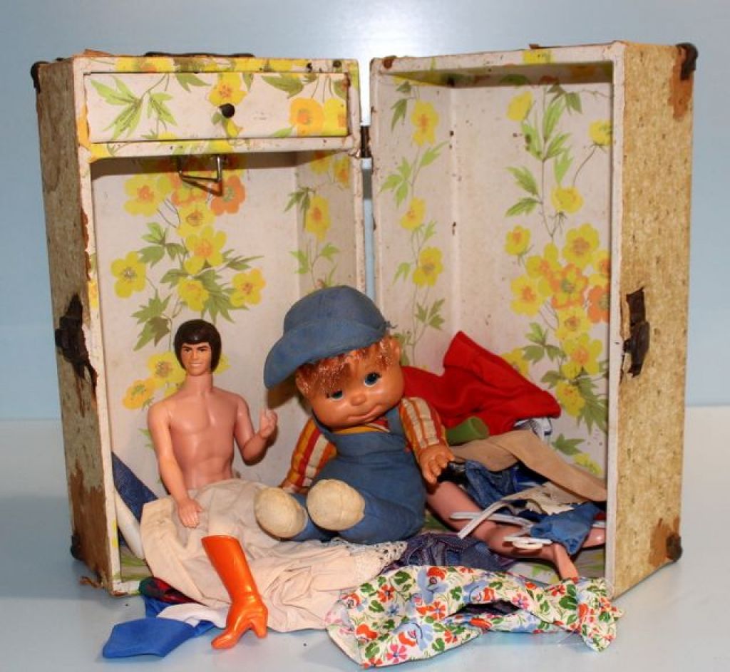 Doll Trunk with Doll 14" w., 8" dia., 8" h. Doll Trunk with Doll 14" w., 8" dia., 8" h.