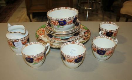 Four English Cups, Sugar, Creamer, Four Saucers, Three Small Plates, Two Cabinet Plates Three small plates 6" dia. ; two cabinet plates 9" dia. With a few hair line cracks Four English Cups, Sugar, Creamer, Four Saucers, Three Small Plates, Two Cabinet Plates Three small plates 6" dia. ; two cabinet plates 9" dia. With a few hair line cracks