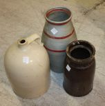 #2 Crock Jug, Brown Crock, and Gray Crock #2 crock jug 14" h. ; brown crock 11" h. ; gray crock 15" h. #2 Crock Jug, Brown Crock, and Gray Crock #2 crock jug 14" h. ; brown crock 11" h. ; gray crock 15" h.