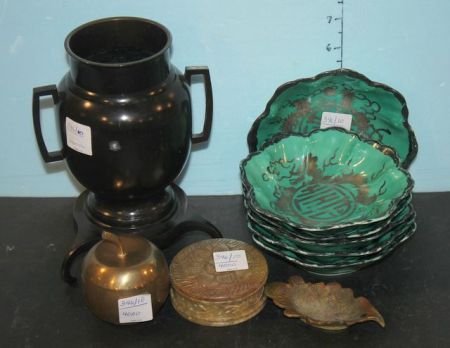 672 Set of Six Chinese Porcelain Bowls, Round Alabaster Box, Small Brass Leaf, Brass Apple, and Metal Oriental Vase Set of six Chinese porcelain bowls with silver overlay and dragon design 5 1/2" dia. ; round alabaster box 3" dia. ; small brass leaf