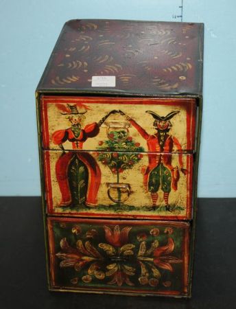Three Drawer Painted Tin Box 7" w., 8" dia., 11" h. Three Drawer Painted Tin Box 7" w., 8" dia., 11" h.