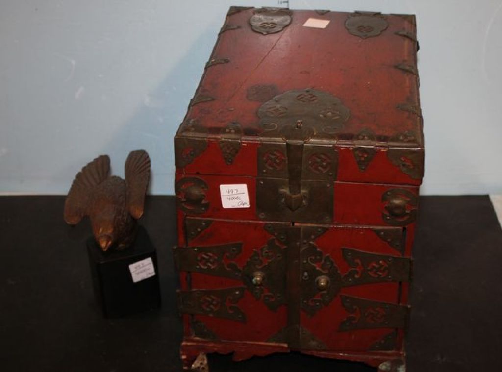 686 Red Oriental Designed Box Box has two drawers and brass detail with a carved wooden eagle on black stand; 11" h., 9" w., 13" dia.