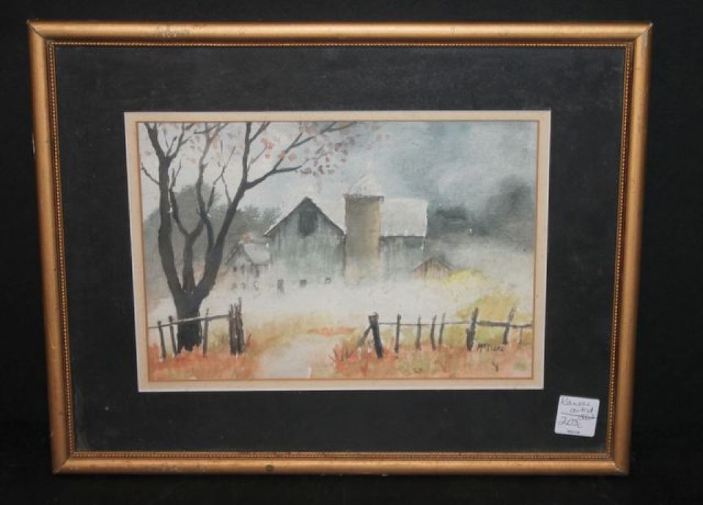 804 Watercolor of Barns in Grown Up Field by McClare Kansas artist, 14"w., 11"h.