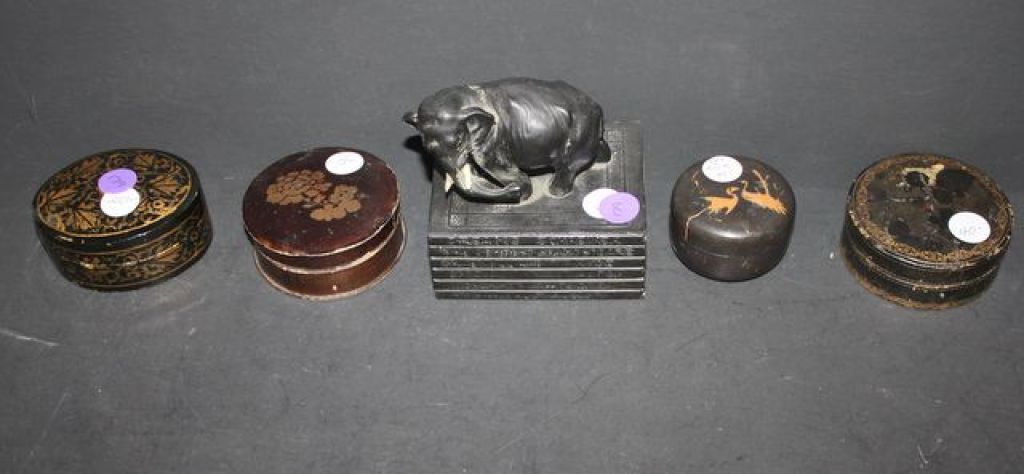 896 Tin Elephant on Stack of Books, Various Painted Boxes boxes 2"dia.