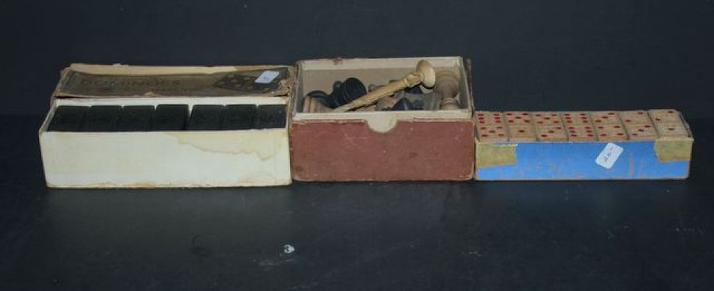 926 Game Pieces 2 boxes of Dominoes, and box of chess pieces