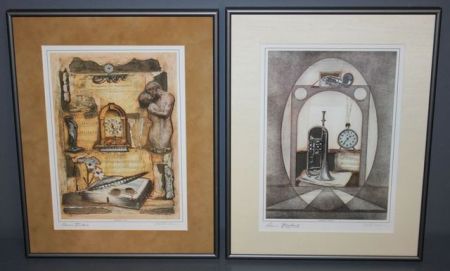 960 Pair of Art Prints by Armin Birkel Austrian born limited edition print of trumpet, and one of lovers, 13"w., 16"h.