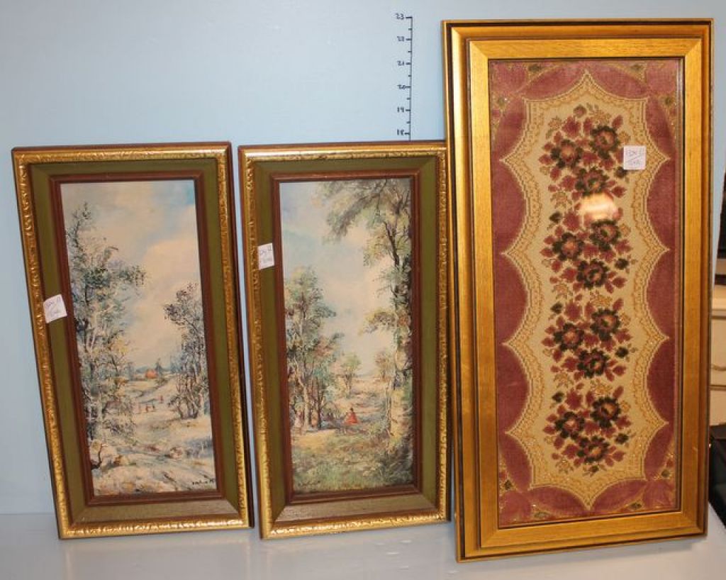 Two Prints on Board and a Framed Needlework Two Prints on Board (artist signed by E. Holusa M. 9" w., 18" h.) and a Framed Needlework (12" w., 23" h.) Two Prints on Board and a Framed Needlework Two Prints on Board (artist signed by E. Holusa M. 9" w., 18" h.) and a Framed Needlework (12" w., 23" h.)