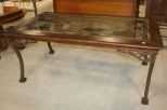 1161 Iron and Wood Dining Table with Glass Top (see chairs lot# 0107) Iron and Wood Dining Table with Glass Top, see matching chairs lot# 0107; 42" w., 72" l., 30" h.