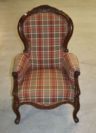 1168 Victorian Walnut Parlor Chair Victorian Walnut Parlor Chair covered in plaid, carved crest; 25" w., 21 1/2" d., 41" h.