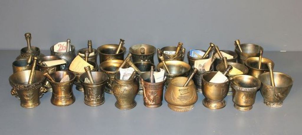 Collection of Twenty Seven Brass Schering Mortar and Pestles Description: Collection of Twenty Seven Brass Schering Mortar and Pestles, these include: 1963 Secundum Artem 9 1/4" dia., Galen 5 1/4" dia., 1986 Statue of Liberty 4" dia., 1989 Lamba Ka Collection of Twenty Seven Brass Schering Mortar and Pestles Description: Collection of Twenty Seven Brass Schering Mortar and Pestles, these include: 1963 Secundum Artem 9 1/4" dia., Galen 5 1/4" dia., 1986 Statue of Liberty 4" dia., 1989 Lamba Ka