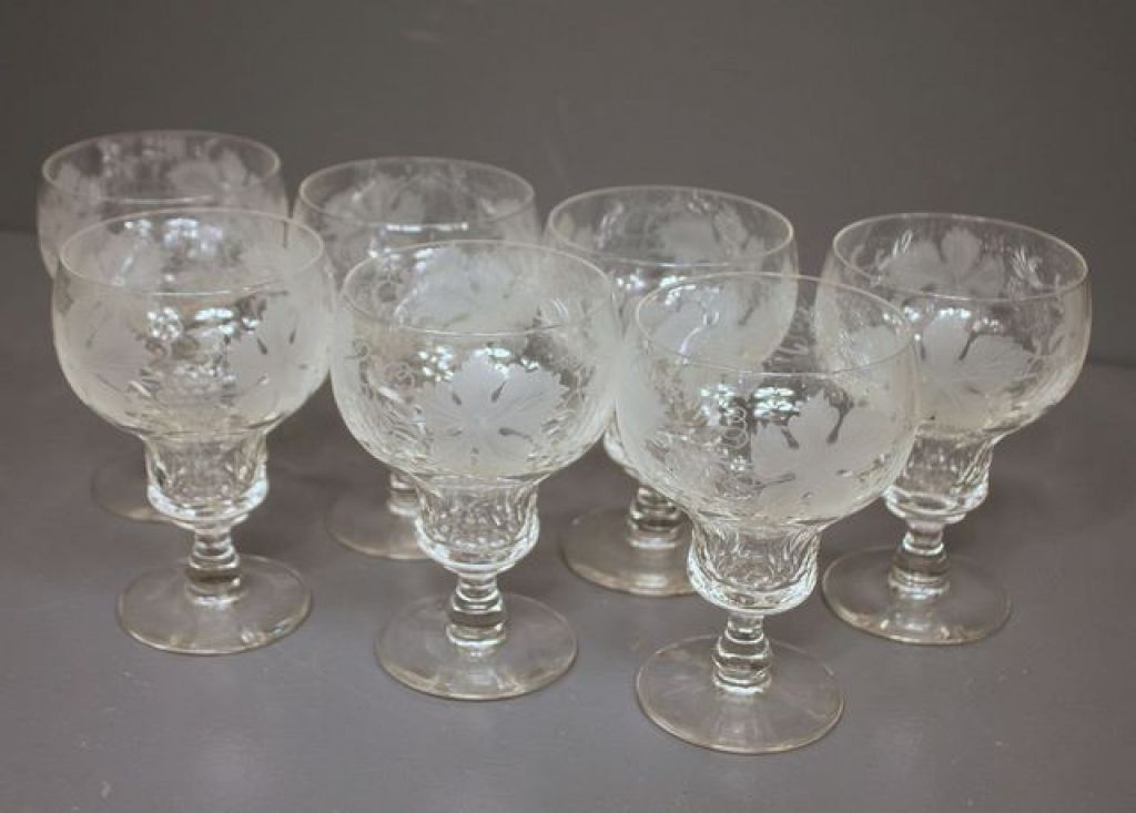 Set of Seven 20th Century Etched Wine Glasses Description: Set of Seven 20th Century Etched Wine Glasses, stems, bowls etched with grapes and leaves; 5 1/2" h. Set of Seven 20th Century Etched Wine Glasses Description: Set of Seven 20th Century Etched Wine Glasses, stems, bowls etched with grapes and leaves; 5 1/2" h.