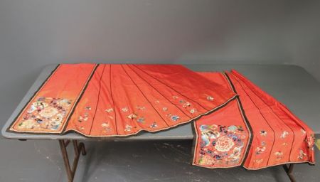 Rare Antique Chinese Wedding Skirt Description: Rare Antique Chinese Wedding Skirt; red silk, two matching aprons which have hand embroidered, colorful forbidden seed stitch peonies, silk thread stitched birds, side panels in silk thread flowers, each apron is 45" w., 35" h. Rare Antique Chinese Wedding Skirt Description: Rare Antique Chinese Wedding Skirt; red silk, two matching aprons which have hand embroidered, colorful forbidden seed stitch peonies, silk thread stitched birds, side panels in silk thread flowers, each apron is 45" w., 35" h.