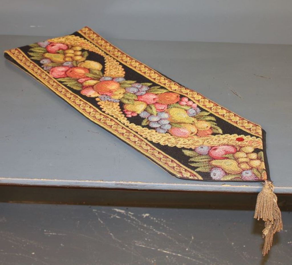 1397 Stitched Table Runner in Vibrant Colors Description: Stitched Table Runner in Vibrant Colors, of fruit with border, tassel on each end 68" l., 11 1/2" w.