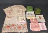 1401 Vintage Napkins Description: Vintage Napkins; twenty 15" square green napkins, six napkins with grape design. Set of four linen tablemats with pink embroidery along with four matching napkins. Various embroidered towels.