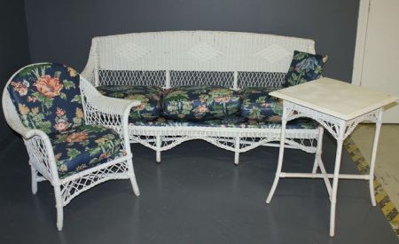 1431 Wicker Patio Set Description: Wicker Patio Set, Couch, Arm Chair and Table; couch 35" h., 81" l., 22" d.