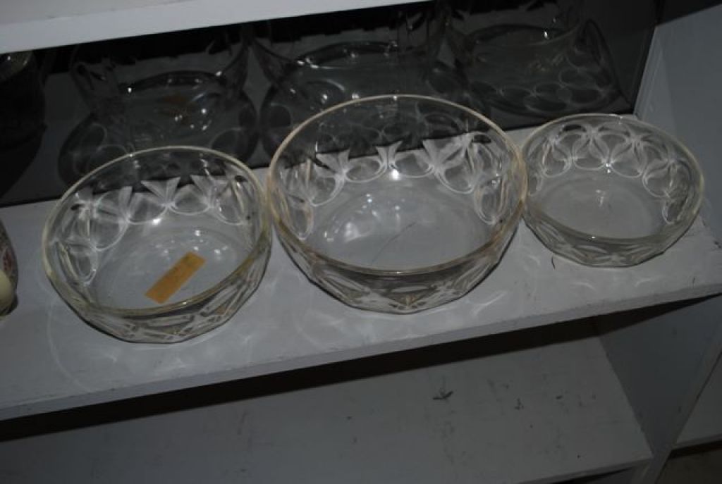 1450 Pyrex Bowls with Tear Drop Design on Sides Description: Set of Three Pyrex Bowls with Tear Drop Design on Sides