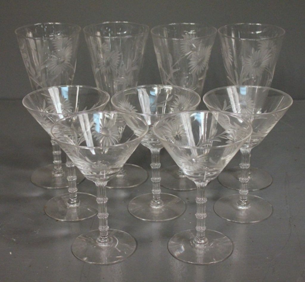 Set of Four Champagne Glasses and Five Martini Glasses Description: Set of Four Champagne Glasses and Five Martini Glasses, etched floral pattern, champagne (7 3/4" h.) martini (5 1/2" h.) Set of Four Champagne Glasses and Five Martini Glasses Description: Set of Four Champagne Glasses and Five Martini Glasses, etched floral pattern, champagne (7 3/4" h.) martini (5 1/2" h.)