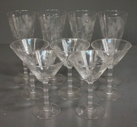 1513 Set of Four Champagne Glasses and Five Martini Glasses Description: Set of Four Champagne Glasses and Five Martini Glasses, etched floral pattern, champagne (7 3/4" h.) martini (5 1/2" h.)