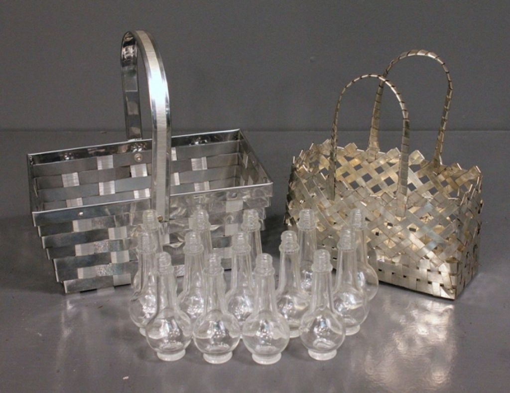 Two Metal Woven Baskets with Fourteen Clear Glass Perfumes Description: Two Metal Woven Baskets with Fourteen Clear Glass Perfumes; basket (8" h., 6 1/4" l., 3 3/4" w.) basket (8 1/2" h., 8 1/4" l., 5 1/4" w.), perfumes 3 1/2" h. Two Metal Woven Baskets with Fourteen Clear Glass Perfumes Description: Two Metal Woven Baskets with Fourteen Clear Glass Perfumes; basket (8" h., 6 1/4" l., 3 3/4" w.) basket (8 1/2" h., 8 1/4" l., 5 1/4" w.), perfumes 3 1/2" h.