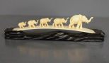 1519 Decorative Elephant Figurines on Wooden Stand Description: Decorative Elephant Figurines on Wooden Stand, plastic elephants following in a row, arch shape on a wooden stand