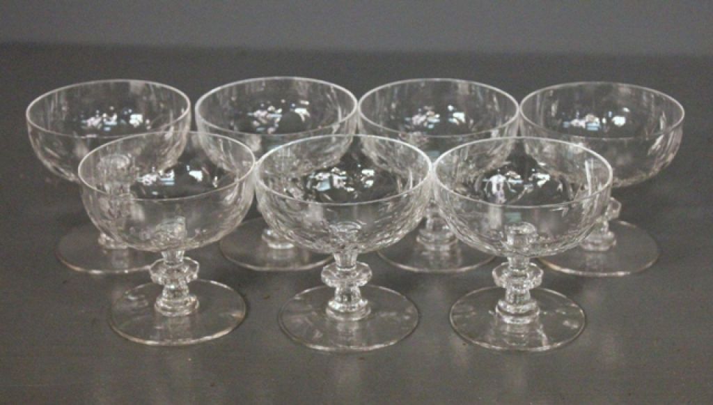 Set of Seven Cut Glass Champagne Glasses Description: Set of Seven Cut Glass Champagne Glasses; 3" h. Set of Seven Cut Glass Champagne Glasses Description: Set of Seven Cut Glass Champagne Glasses; 3" h.