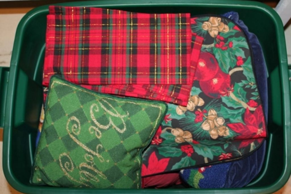1560 Miscellaneous Christmas Decorations Description: Miscellaneous Christmas Decorations; pillows, placemats, tablecloths