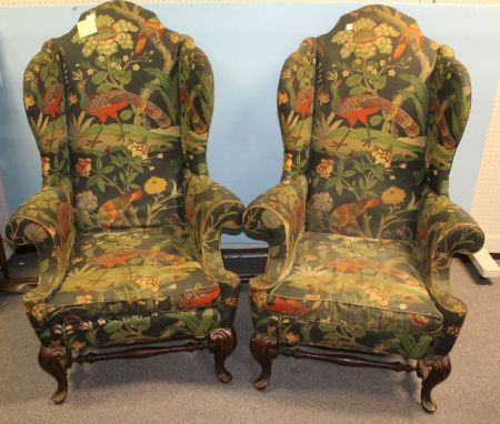 1577 Pair High Style Wing Back Chairs 34" w., 26" d., 54" h.
