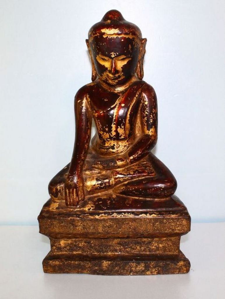 1585 Wood Carved Buddha Possibly Tibetan, hand carved, wooden Buddha with gold leaf highlights; 8" w., 15" h.