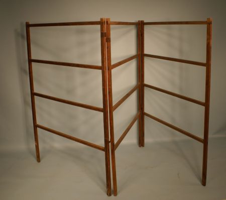 Primitive Drying Rack in Pine, last quarter 19th century, with 12 drying rods pegged through the standing frame. 54 1/2" h., 39" w. Primitive Drying Rack in Pine, last quarter 19th century, with 12 drying rods pegged through the standing frame. 54 1/2" h., 39" w.